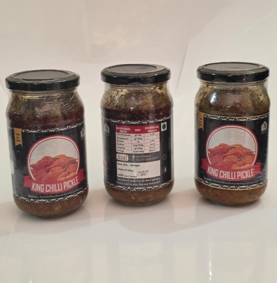 A fiery vegetarian pickle made from handpicked King Chillies cultivated in the high-altitude hills of Northeast India. Once the chillies are carefully stemmed and washed, they’re stone-ground and preserved in cold-pressed mustard oil along with garlic, ginger, and fenugreek. This age-old preparation technique enhances both flavour and shelf life, delivering a bold, smoky heat with every spoonful — a classic example of Northeast India’s preserved delicacies.